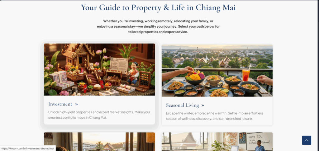 Kesorn.co.th is a Thailand-based real estate platform offering tailored property solutions and expert guidance in Chiang Mai and surrounding regions. The site caters to investors, digital nomads, families, and seasonal residents seeking property and lifestyle options.